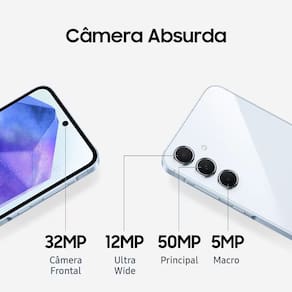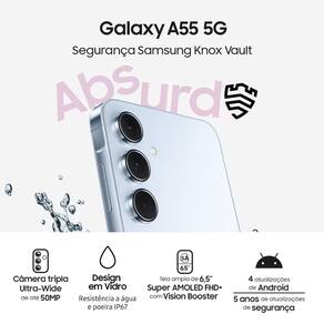 O Galaxy A55 5G é o Smartphone que combina com você! Com design premium em metal e vidro, resistência a água e poeira (IP67) e alto desempenho para o dia a dia.
