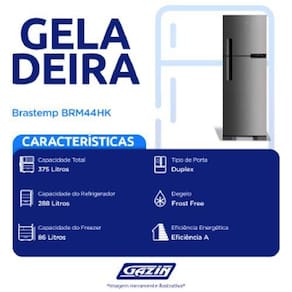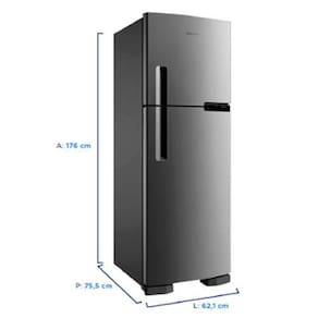 Ref 375l Brastemp 2p Frost Free - Brm44hkbna CARACTERÍSTICAS GERAIS Modelo: BRM44HK Cor: Inox Capacidade total: 375 litros Capacidade da geladeira em volume: 288 litros Painel: Eletrônico Tipo de Porta: Duplex Quantidade de portas: 2 portas Quantidade de níveis de temperatura: Freezer: 3 níveis / Refrigerador: 5 níveis Número de grades da geladeira: 03 grades Material das prateleiras da geladeira: Plástico injetado Portas reversíveis: Não Gaveta de vegetais: Sim Gaveta multiuso: Não Porta latas: Sim Controle de temperatura do refrigerador: Sim Dispenser de água: Não Dispenser de gelo: Sim Alarme de porta aberta: Não Luz interior: Sim CARACTERÍSTICAS DO FREEZER Capacidade do freezer em volume: 86 litros Tipo de degelo: Frost Free Freezer: Sim Congelador: Não Controle de temperatura do freezer: Sim Fabricador de gelo: Não CARACTERÍSTICAS ELÉTRICAS Eficiência energética: A Potência: 110V: 110 W / 220V: 104 W Consumo: 54 kW/h Frequência: 60 Hz DIMENSÕES Altura: 176 cm Largura: 62,1 cm Profundidade: 75,5 cm Peso: 58 kg EMBALAGEM Altura: 180 cm Largura: 65,2 cm Profundidade: 74,7 cm Peso: 65 kg : 12 meses Cor: INOX - Voltagem: 220 VOLTS Marca: Não Informado