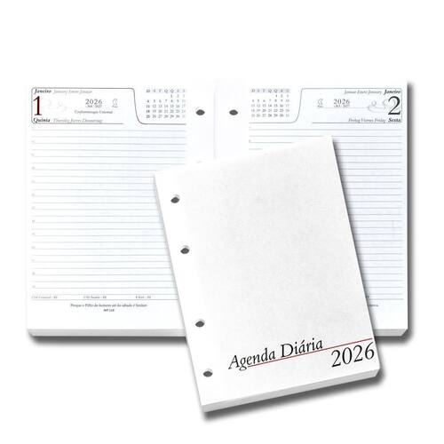 Refil do ano de 2026 para agendas com ferragem 4 argolas contendo: