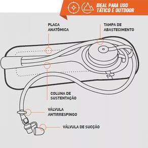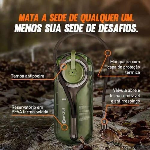 Refil Camelback Invictus Viper 2l Água Hidratação Esportes Ciclismo O refil de hidratação Viper é um reservatório de água potável para usar em mochilas e apoiar o usuário em operações táticas, atividades físicas ou em situações outdoor. Fabricado em plástico PEVA de alta resistência, sua composição é livre de substâncias voláteis, nocivas ao organismo. Comporta até 2 litros e tem como principal diferencial o sistema de sustentação por coluna plástica e placa anatômica. Essas características contribuem para que o refil não se dobre quando vazio. As mangueiras possuem sistema de engate rápido, que permite a liberação da válvula de sucção para retirada da água acumulada após o uso, auxiliando também a higienização do produto. Informações Técnicas: Reservatório para 2 litros, produzido em PEVA termo selado Mangueira de 100cm com capa de proteção térmica e acabamento emborrachado Coluna de sustentação para evitar que o refil se dobre Placa anatômica ergonômica para adaptação à região dorsal Tampa com 85mm de diâmetro para facilitar o abastecimento e higienização Válvula abre e fecha antirrespingo Válvula de sucção em silicone, removível e com tampa anti poeira Dimensões: 42,5cm x 19cm Peso: 478g CUIDADOS Lavar e secar completamente o reservatório após o uso para protegê-lo contra bactérias e outros microrganismos nocivos à saúde Utilize apenas água e sabão neutro para higienizar seu refil Evitar o contato com calor ou frio extremo, produtos químicos, raios UV e objetos pontiagudos A coluna de sustentação não é removível. Forçar sua retirada pode provocar danos ao seu refil Advertência: Este produto não deve ser usado por crianças em função da presença de peças removíveis, que podem causar sufocamento. undefined