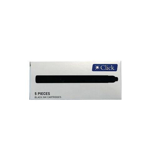 Refil de tinta para canetas tinteiro, padrão internacional, da marca Click. Embalagem contendo 5 unidades com tamanho longo, na cor preta, garantindo quase o dobro de tinta em relação aos refis convencionais.