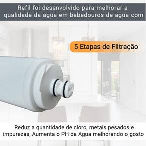 Refil com 5 etapas de filtração: 1- elemento em polipropileno 5 micras, 2- dolomita, 3- elemento em polipropileno 15 micras, 4- carvão, 5- elemento em polipropileno 15 micras. Remove impurezas, reduz cloro livre e possui eficiência bacteriológica.Tipo