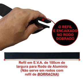 Refil de eva para rodo de aluminio 100cm 1m e.V.A. Refil de eva para rodo de aluminio 100cm 1m e.V.A. Observação: não serve nos rodos que usam refil de borracha. Para aplicação em rodos de alumínio que usam a espuma e.V.A. etileno acetato de vinila . O rodo tradicional de borracha tende à rasgar em pouco tempo de uso, ainda mais quando se usa para passar pano, pois é feito o movimento de vai e vem com ele. Muitas pessoas acabam tendo uma troca muito cedo do refil nesses casos. Já no caso do eva, por ser mais resistente, pode ser para enxugar e passar pano. Além de ser muito bem utilizado no uso industrial devido a sua qualidade. O que é o etileno acetato de vinila eva O eva é um polímero emborrachado, flexível, com propriedades adesivas e componentes à prova dágua. É obtido através do copolímero de etileno-acetato de vinila, em artesanato e em diversas outras aplicações. Além disso, o eva é matéria prima para brinquedos e utilitários como revestimento de óculos de natação. Por ser mais leve que a água, é como flutuador ou bóia, além de aplicado em chinelos e sandálias. É um produto competitivo em relação a outros termoplasticos e borrachas. atóxico, inodoro, lavável e disponível geralmente em chapas com diversas espessuras, cores, densidades e acabamentos. Tipos especiais de eva são na formulação de adesivos hot melt, apresentando flexibilidade e aderência mesmo em baixas temperaturas.