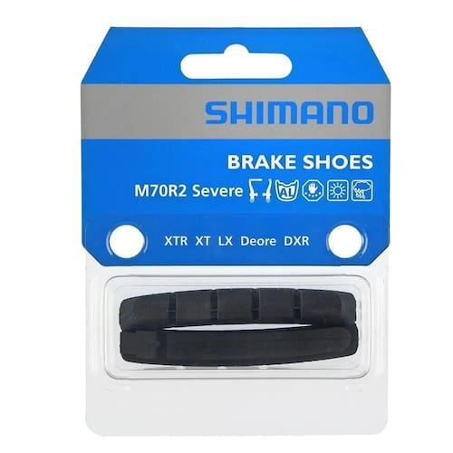 Refil de sapata de freio - shimano m70r2 severe - deore Refil para sapata de freio v-brake shimano m70r2 severe 72mm para xtr, xt, lx, deore, dxr. Borracha de freio shimano y8aa98200, podendo ser utilizado tanto no freio dianteiro como no traseiro, com 72 milímetros de comprimento, cumpre muito bem sua função inclusive em dias de chuva, onde mesmo com a roda molhada sua eficiência não é afetada. Sapata com material muito resistente que fica em contato com a roda, oferecendo maior potência para melhor frenagem durante o pedal. marca: shimano; modelo: m70r2 severe; material: borracha; peso: 13 gramas; cor: preto; para aro de alumínio; grupo: xtr, xt, lx, deore, dxr; comprimento da borracha: 72mm; compatibilidade: br-m970, br-m960, br-m951, br-m950, br-m770, br-m760, br-m750, br-m739, br-m737, br-m600, br-m580, br-m570, br-m530, br-m510, br-m432, br-m431, br-m430, br-m422, br-m421, br-m420, br-m330, br-t660, br-t300, br-mx70, br-mc18; contem 1 um par de refil de sapata de freio o suficiente para 1 um freio dianteiro ou traseiro acompanha travas.