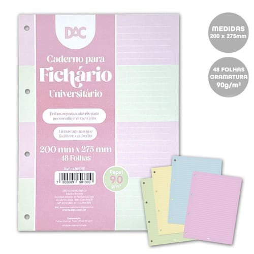 Refil fichário universitário 200x275mm 48fl enjoy 4cores dac o refil de folhas para caderno argolado universitário é perfeito para reposição e dar continuidade nos estudos. Possui 48 folhas pautadas em linhas brancas e é ideal para o dia a dia na escola ou na faculdade. Agora você tem folhas decoradas para incrementar ainda mais seu fichário, são folhas cheia de chame características: - marca: dac; - 4 furos; - 4 cores azul, amarelo, verde e rosa ; - folhas pautadas com linhas brancas que facilitam a escrita; - 48 folhas personalizadas; - papel off-set 90g/m; - tamanho universitário: 200 x 275mm; - referência: 4165re. -imagens meramente ilustrativas- atenção: a cor do produto pode variar de acordo com o monitor atenção: o fabricante pode alterar a cor de alguma parte do produto sem aviso prévio. Ean: 7908689901300