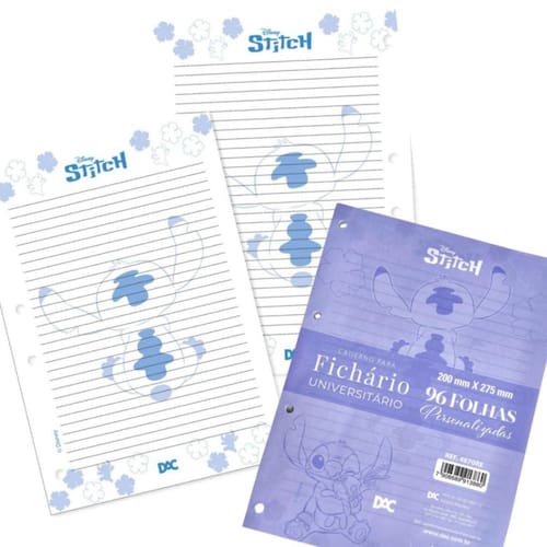 Este refil de folhas é ideal para quem deseja adicionar um toque divertido e estiloso ao seu fichário universitário. Com um design inspirado no personagem stitch da disney, as folhas são decoradas, proporcionando um visual único e atraente.
