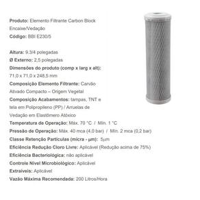 Refil filtro carvão ativado carbon block 9.3/4 para filtros BBI POU230, remove cloro, evita bactérias, reduz cor e turbidez.Tipo