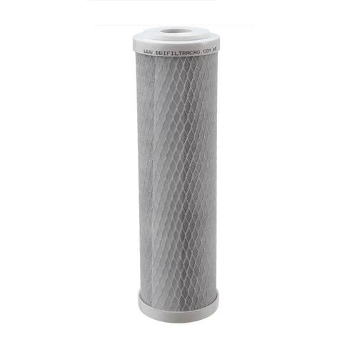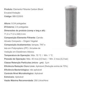 Elemento filtrante de carvão ativado compacto (Carbon Block). Encaixe com vedação. Altura: 9.3/4 polegadas. Diâmetro Externo: 2.1/2 polegadas. Grau de filtragem: Classe C (5 a 15 micra). Origem vegetal do carvão ativado.Tipo