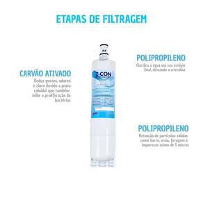Refil com tripla filtração, alta eficiência na retenção de resíduos, máxima redução de cloro, elimina odores e sabor desagradável. Vazão: 40 l/h. Pressão: de 19,6 a 392 kpa. Vida útil: 2500 l.Tipo