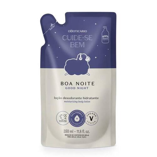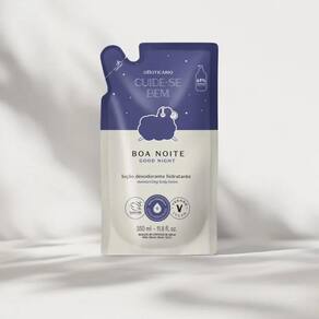 Já pensou em manter sua pele hidratada o tempo todo com seu creme preferido sempre à sua disposição A Loção Desodorante Hidratante Cuide-se Bem Boa Noite traz uma opção de autocuidado aonde você for Com ativos mais hidratantes, o hidratante desodorante corporal da linha Boa Noite entrega muita hidratação para uma pele bem tratada e bem resolvida. Esta loção corporal tem textura cremosa e toque aveludado com de Karité e Glicerol, cuidando da sua pele enquanto a mantém perfumada com a fragrância relaxante de Cuide-se Bem Boa Noite. Confira mais benefícios: - Pele macia, perfumada e desodorizada; - 5x mais camomila; - Rápida absorção; - 48h de hidratação; - Vegano; - Refilável; - Livre de parabenos, silicones e petrolatos. Com 95,4% de ingredientes naturais e embalagem com plástico vegetal, este item oferece uma opção de hidratação intensa, prática e sustentável. A Loção Desodorante Hidratante Cuide-se Bem Boa Noite é ideal para uma rotina mais leve e cheia de cuidados. Nenhum produto do Boticário é testado em animais, ou seja, este item possui selo Cruelty Free. Marca: Não Informado Ean: 7891033498796