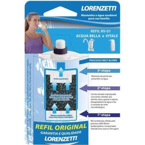 Refil para filtro Aqua Bella e Vitale pode ser utilizado nestes dois modelos de filtros - Refil RV 01 retém particulas - Retira o excesso de cloro, gostos e odores desagradáveis - Elimina partículas sólidas como limo,barro e ferrugem.