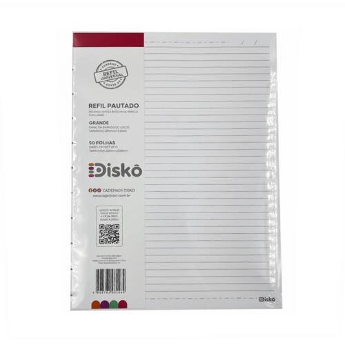 - Marca: Disko - Modelo: Refil Pautado Grande - Cor: Branco - Dimensões: 215x292mm - Gramatura: 90g - Referência: RF21C062