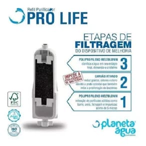 Refil pró life Variações do produto Código: 1013 - encaixe e rosca especial Compatível com aparelhos: soft everest. As marcas citadas são propriedades de seus respectivos fabricantes e aparecem apenas para demonstrar a compatibilidade deste produto. Descritivo técnico Vida útil aproximada: 4000 6 a 9 meses Vazão: 60 litros/hora Retenção de partículas: classe c 5 a 15 Com redução de cloro de livre Dimensões do produto: 240x77x77 mm Dimensões da embalagem: 251x78x79 mm Peso bruto aproximado: 0,437 kg Temperatura de operação: 1 a 40 c Pressão de operação: 29 a 392 kpa Composição: polipropileno, polipropileno meltblown, carvão ativado e borracha de vedação nbr Conteúdo da embalagem 01 refil pró life Informações adicionais: Produto com pelo fabricante; Marca: Não Informado Ean: 7898614791994