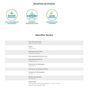 Em relação às especificações técnicas, o refil possui uma vida útil aproximada de 1500 litros ou de 6 a 9 meses. A vazão é de 20 litros por hora e a retenção de partículas é da classe D, de 15 a 30 micra. O produto tem dimensões de 155x66x66 mm e a embalagem mede 290x165 mm. O peso bruto aproximado é de 0,173 kg. A temperatura de operação recomendada é de 1 a 40 °C e a pressão de operação deve ser de 29 a 392 kPa. A composição do refil é feita de polipropileno, polipropileno MeltBlown, carvão ativado e borracha de vedação NBR .