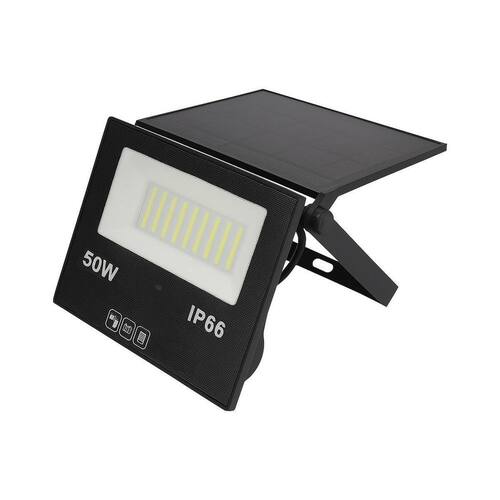 Cor: Preto Temperatura de cor: 6500K - Branco Frio Potência: 50W Grau de proteção: IP66 resistente à chuva e poeira Bateria: Li-ion Vida útil: 50.000h Tempo de carga total: 4 a 6 horas sob sol direto Autonomia: 10 a 12 horas de iluminação