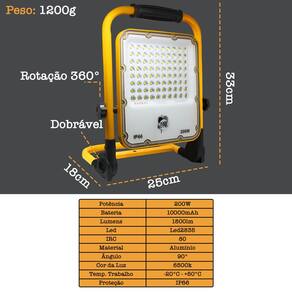 #Especificações - Potência: 200W - Cor: 6500K (Branco Frio) - Lúmens: 1800lm - Ângulo de Abertura: 90° - Bateria: 10.000mAh/3.2V - IRC (Índice de Reprodução de Cor): 80 - IP (Índice de Proteção): 66 - Vida Útil: 30.000h - Dimensões: 33x25×18CM - Peso: 1200g - Duração da Bateria: 24h