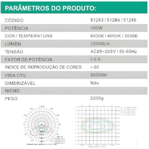 #ESPECIFICAÇÕES: Potência: 100W Cor da Luz: 6000K (Branco Frio) Lúmens: 12000lm Tensão: AC85~265V - 50/60Hz Fator de Potência: 0.9 IRC: 80 Vida Útil: 50000H Não é dimerizável Peso: 2200g Dimensões: 33cm (C) x 8cm (L) x 15,5cm (A)