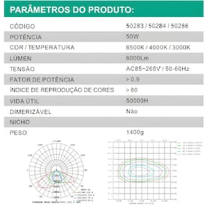 #ESPECIFICAÇÕES: Potência: 50W Cor da Luz: 6000K (Branco Frio) Lúmens: 6000lm Tensão: AC85~265V - 50/60Hz Fator de Potência: 0.9 IRC: 80 Vida Útil: 50000H Não é dimerizável Peso: 1400g Dimensões: 33cm (C) x 8cm (L) x 7,5cm (A)