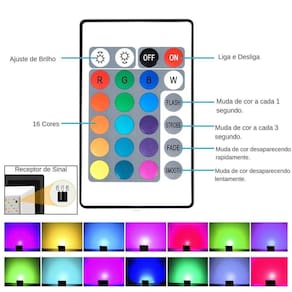 Manual rápido: - Procure um profissional especializado para a instalação. - Desligue a rede elétrica antes da instalação ou substituição deste produto. - Solte o lacre Fita transparente do controle remoto para sua operação - Liga On e Desliga OFF - Intensidade de brilho: Precisa segurar o botão para mudar a intensidade da luz - Flash: Mudança lenta de cores - Strobe: Mudança rápida de cores luzes piscando - Fade: Acende e apaga rapidamente as cores - Smooth: Acende e apaga suavemente as cores - Quando for ativado algum efeito, precisando desativar é somente acionar quaisquer um dos botões de cores do controle - Quando o controle parar de funcionar a bateria modelo CR2025 deverá ser substituída
