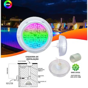 01 refletor power led 5w rgb em policarbonato iluminação para piscina - brustec 01 cabo manga 4 vias awg de 2 metros 01 manual de instalação