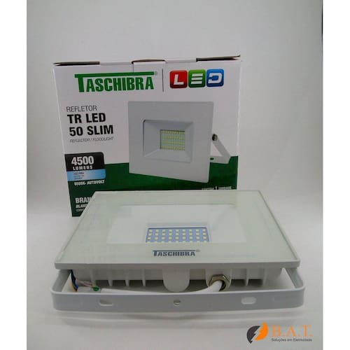Marca: taschibra Cor: branca Refletor led Potência máxima: 50w Ângulo de abertura: 120º Voltagem: bivolt Fluxo luminoso: 4500 lúmens Frequência: 50/60 hz Grau de proteção: ip 65 - uso externo Vida útil: 20.000 horas Driver: interno Temperatura de operação: 10c a 40c