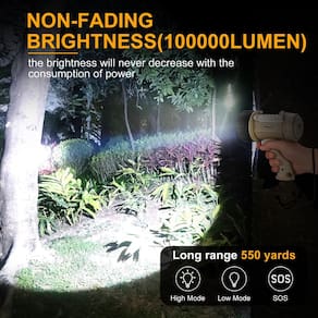Lanterna resistente extra brilhante: seu brilho é várias vezes maior que o do modelo pequeno. Este holofote de LED extra brilhante lança um feixe de 90.0000 lúmens altos para incríveis 500 metros. Os LEDs têm uma vida útil prolongada de 50.000 horas. Possui 4 configurações adaptáveis: alta/média/baixa/SOS (pressione por 3 segundos).