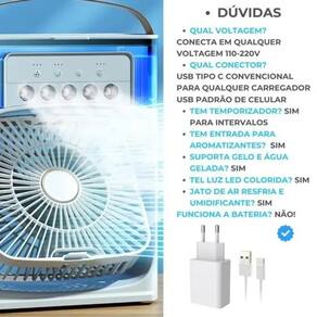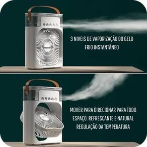 Refresque-se com estilo: Ventilador bivolt com design moderno e eficiente Mini Climatizador Portátil 3 em 1: Ventilador, Umidificador e Ar Condicionado O Mini Climatizador Portátil é a solução perfeita para manter qualquer ambiente fresco e confortável durante os dias mais quentes. Compacto, prático e eficiente, ele reúne as funções de ventilador, umidificador e climatizador em um só aparelho, tornando-se ideal para espaços pequenos. Com a possibilidade de utilizar água ou gelo, você pode desfrutar de um ar mais refrescante de forma silenciosa e com baixo consumo de energia, alimentado via USB. Principais Características: Climatização eficiente: Refresca o ambiente, criando uma zona de conforto adequada para o seu espaço pessoal. 3 velocidades de ventilação: Escolha entre baixa, média e alta, ajustando a intensidade do fluxo de ar conforme sua necessidade. Níveis de umidificação ajustáveis: Oferece três níveis de umidificação baixo, médio, alto , personalizando o nível de frescor no ambiente. Até 12 horas de uso contínuo: Com capacidade de um tanque de 600ml, garante umidificação e resfriamento por longos períodos, sem precisar reabastecer. Refrigeração instantânea: Adicione água gelada ou gelo ao tanque para obter um ar fresco de forma imediata. Iluminação LED suave: Luzes de baixa intensidade são ideais para uso noturno, proporcionando um ambiente aconchegante sem incomodar. Timer programável: Programe o climatizador para desligar automaticamente entre 2,5 e 12 horas, garantindo mais praticidade e economia de energia. Conexão USB: Fácil de conectar a carregadores USB de parede ou power banks. Evite conectá-lo a computadores ou notebooks, pois a energia fornecida pode não ser suficiente. Especificações Técnicas: Potência: 10W - Consumo eficiente, ideal para uso prolongado. Capacidade do Tanque de Água: 600ml - Oferece até 12 horas de umidificação contínua. Dimensões: 26cm x 21cm x 9cm - Compacto e fácil de transportar para qualquer ambiente. Modos de Ventilação: Alto, Médio e Baixo - Ajuste conforme sua necessidade. Nível de Ruído: Inferior a 42dB - Operação extremamente silenciosa, ideal para uso durante o trabalho ou sono. Tensão: 5V-2A - Compatível com carregadores USB de alta potência. Peso: 726g sem água - Leve e fácil de transportar. O Pacote Inclui: 1x Mini Climatizador Portátil 1x Cabo USB 1x Manual de Instruções Benefícios do Mini Climatizador Portátil Com um design moderno e funcional, este mini climatizador é a escolha perfeita para quem busca uma solução prática para manter pequenos ambientes confortáveis e bem climatizados. Sua combinação de ventilação, umidificação e resfriamento o torna ideal para quem precisa de um aparelho portátil e eficiente para usar em casa, no trabalho, em viagens ou em qualquer outro lugar onde o frescor seja necessário. O climatizador permite um controle completo de suas funções, desde a velocidade do ventilador até o nível de umidade, além da possibilidade de adicionar gelo ao tanque para intensificar o resfriamento. Tudo isso com um baixo nível de ruído, que garante que o aparelho possa ser em qualquer ambiente sem causar incômodo, inclusive à noite. Como Funciona: Adicione água ou gelo ao tanque e escolha a velocidade de ventilação e o nível de umidificação desejados. O aparelho resfria o ar ao evaporar a água do tanque, criando um fluxo de ar fresco e agradável. O design compacto e a alimentação via USB permitem que você o leve para onde for necessário, proporcionando uma climatização eficiente e personalizada. Garanta o Seu Agora Em caso de dúvidas, nossa equipe de atendimento está disponível para te ajudar
