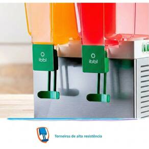 Refresqueira com 2 depósitos independentes de 15 litros cada, totalizando 30 litros. Estrutura em aço inox e depósitos em policarbonato cristal. Sistema de agitação por pá. Torneiras desmontáveis 'Easy Clean'. Pingadeiras removíveis.Água gelada