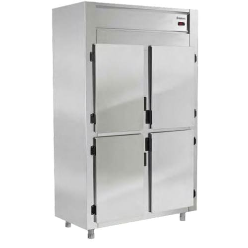 Refrigeração de produtos em cozinhas industriais de hotéis,restaurantes, clubes, bares, lanchonetes, confeitarias,mercados, mercearias e outros Temperatura: +1° a +°7C Refrigeração: Ar forçado com serpentina aletada Controle de Temperatura: Controlador Eletrônico Digital, com indicador digital de temperatura e degelo automático natural Prateleiras: 4 níveis, aramadas, reguláveis; um nível pode ser usado como estrado Revestimento Externo: ? GREP-4P/6P: Aço Inox 430 Revestimento Interno: Aço Galvanizado Parte frontal sem aquecimento no quadro de portas, podendo ocorrer condensação da umidade do ar Construção do Gabinete: Monobloco Pés reguláveis