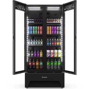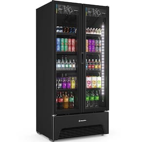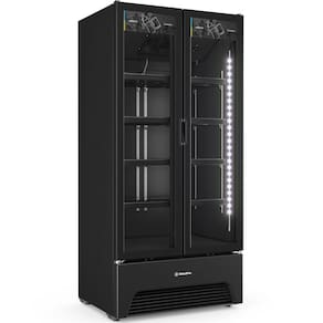 Refrigerador Expositor Optima All Black Porta Dupla Slim 752 Litros VB70AH Metalfrio. Ideal para restaurantes, lanchonetes, bares e similares. Possui sistema de refrigeração com fluxo de ar contínuo. São 8 prateleiras com regulagem independente. A Iluminação é em LED, suas portas contam com fechamento automático. Evaporador aletado. Gás ecológico. POTÊNCIA: 410W. CAPACIDADE: 752 Litros. ARMAZENAMENTO: 1008 Latas de 269 ml, 756 Latas de 350 ml, 240 Garrafas Pet 600 ml e 72 Garrafas Pet 2 litros. TEMPERATURA: +2 a +8°C. PORTAS: 2. PRATELEIRAS: 8. PESO: 145,45kg. DIMENSÕES EXTERNAS(CxAxL): 94x202,2x69,7cm. Com os Selos de Qualidade ISO 9001 e de Gestão Ambiental ISO 14001. Refrigerador Expositor Optima All Black Porta Dupla Slim 752 Litros VB70AH Metalfrio é na Atau.