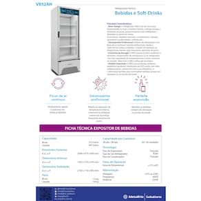 VB52AH Optima Metalfrio: Refrigerador Vertical - A mesma tecnologia das maiores marcas, agora com novo design!Novo Design: O refrigerador VB52 está de cara nova! Desenvolvido no novo Conceito Optima, o design alonga a dimensão da porta, proporcionando mais visibilidade e destaque no ponto de venda. A veneziana, também renovada, complementa o design, garantindo modernidade e sofisticaçãoPrecisando de espaço, capacidade e bebidas na temperatura ideal? Você precisa conhecer o VB52 Optima Metalfrio.Desempenho Profissional: Sistema de refrigeração com fluxo de ar contínuo. Garante resfriamento rápido e uniforme em todas as bebidas, e rápida recuperação de temperatura, mesmo após frequentes aberturas de porta.Perfeita Exposição: O VB52 possui design moderno, prateleiras ajustáveis, iluminaçao em led, porta com vidro antiembaçante, sistema frost free e precificadores. A combinaçao perfeita para você manter bebidas sempre em destaque no seu ponto de venda.Economia de Energia: O VB52 possui os mais modernos e eficientes componentes de refrigeração. é um refrigerador com alta capacidade de armazenamento e baixo consumo de energia. Além disso o VB52 utiliza gás ecológico. é a mesma tecnologia de ponta encontrada nos equipamentos fornecidos para as principais marcas de bebidas do mundo.VB52AH Optima: Desempenho superior, menor consumo de energia e a satisfação que só um equipamento fornecido pela marca líder em refrigeração comercial na América Latina, pode oferecer!Características Principais Evaporador aletado: Fluxo de ar contínuo, para resfriamento rápido e uniforme de todas as bebidas, essencial para o uso comercial. Perfeita exposição: Mantém as bebidas sempre em destaque no ponto de venda. Iluminação interna com lâmpadas led: Permite melhor visibilidade e destaque dos produtos, durabilidade e economia de energia. Porta de vidro antiembaçante: Facilita a visualização interna e exposição do produto, gerando o desejo de compra no cliente. Trava de carga: facilita o abastecimento de seu refrigerador. Prateleiras suspensas e reguláveis: Com pintura em esmalte epóxi são mais resistentes à corrosão e perfeitas para variadas formas e tamanhos de produtos. Sistema Frost Free: não precisa descongelar seu equipamento.Metalfrio: todo mundo conhece, todo mundo confia. A Metalfrio é a marca de refrigeração comercial mais tradicional e líder de mercado no Brasil, com presença em 9, de cada 10 estabelecimentos comerciais do país. Um nome que inspira confiança em milhares de donos de estabelecimentos comerciais que planejam com cuidado cada detalhe de seu negócio e, por isso, fazem questão de ter os melhores equipamentos e a certeza de ter feito um bom negócio!Capacidade Bruta: 572 litros Capacidade Líquida: 497 litros Capacidade de Armazenamento: 576 Latas de 350 ml 196 Garrafas Pet 600 ml 72 Garrafas Pet 2 litrosLargura: 675 mm Altura: 2044 mm Profundidade: 850 mm Peso Líquido: 132 kg Faixa de Temperatura: + 2 a + 8°C Classificação do Produto: Refrigerador Prateleiras: 4 (3 reguláveis + 1 grade de fundo)Serviço de Pós-Venda A Metalfrio oferece a maior estrutura de Serviços de Assistência Técnica do Brasil, com cobertura em todo o território nacional. Sempre que precisar, ligue para: 0800-702-0052.Garantia Especial Distribuidor Metalfrio: 24 meses. Detalhes consulte o Manual de Instruções.