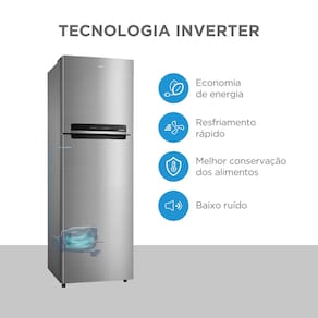 Equipada com tecnologia Inverter, proporciona melhor conservação dos alimentos, baixo ruído e economia de energia, contando com classificação A no novo padrão do INMETRO. O sistema Frost Free garante degelo automático, eliminando a necessidade de descongelamento manual.