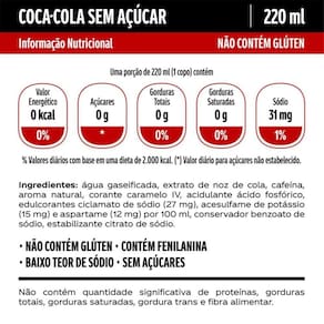 Refrigerante COCA COLA Sem Açucar Lata 220ml 12 Latas Refrescante e saborosa, a Coca Cola Sem Açúcar é a opção perfeita para quem busca um refrigerante com todo o sabor característico da marca, mas sem adição de açúcares. Com sua fórmula exclusiva, a Coca Cola Sem Açúcar oferece uma experiência única de sabor, com zero açúcar e menos calorias. Ideal para acompanhar suas refeições ou para refrescar o dia a dia, a Coca Cola Sem Açúcar Lata 220ml é uma excelente escolha para quem deseja desfrutar de uma bebida saborosa e refrescante sem abrir mão de uma alimentação saudável. Ficha Técnica: Nome: Coca Cola Sem Açúcar Lata 220ml Marca: Coca Cola Volume: 12x220ml Tipo de Embalagem: Lata Ingredientes: Água gaseificada, extrato de noz de cola, cafeína, aroma natural, corante caramelo IV, acidulante ácido fosfórico, edulcorantes ciclamato de sódio 27mg , acesulfame de potássio 15mg e aspartame 12mg por 100ml, conservador benzoato de sódio e estabilizante citrato de sódio. NÃO CONTÉM GLÚTEN