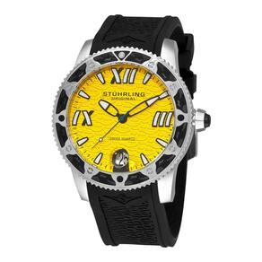 Este relógio tem um tamanho de 47 mm e é resistente à água até 10 ATM, o que equivale a 100 metros ou 330 pés. Sua moldura é CoinEdged com padrão de onda em relevo e sua pulseira é feita de borracha de silicone com padrão de onda e logotipo Stuhrling Wings, medindo 24 mm de largura.