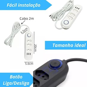 Régua de 3 tomadas 3 usb para carregar celular univ 2 metros Descrição do anúncio: A régua elétrica com 3 tomadas e 3 usb bivolt é a solução ideal para quem busca praticidade e segurança no dia a dia. Com três tomadas universais e três portas usb 5v 2.1a , esta extensão oferece carregamento rápido e eficiente para diversos dispositivos. Seu cabo de 2 metros proporciona maior alcance, enquanto o design compacto e leve facilita o transporte e o uso em diferentes ambientes. Ideal para carregar celulares, alto-falantes usb, ventiladores usb e outros produtos térmicos usb, essa régua é perfeita para uso doméstico e pequenos escritórios. Conteúdo da embalagem: 01 x régua elétrica com 3 tomadas e 3 usb Características: 3 tomadas elétricas espaçadas, permitindo acomodar plugues grandes sem obstruções 3 portas usb para carregar dispositivos móveis como smartphones e tablets Design moderno e funcional, compacto e leve, fácil de transportar Proteção contra surtos elétricos e sobrecargas, garantindo a segurança dos aparelhos conectados Compatível com redes elétricas 127v/220v, funcionando como bivolt automático Fusível de proteção integrado para evitar danos em caso de picos de energia Cabo de extensão de 2 metros para maior alcance Especificações: Modelo: filtro de linha com 3 tomadas e 3 usb Material: plástico resistente Cor: branca transparente Compatibilidade: ideal para uso doméstico e pequenos escritórios Dimensões aproximadas: 30 cm de comprimento x 5 cm de largura x 3 cm de altura Principais perguntas sobre o produto e respostas: O produto é bivolt Sim, o produto é compatível com redes elétricas de 127v e 220v, funcionando como bivolt automático. Qual é o comprimento do cabo de extensão O cabo de extensão tem 2 metros de comprimento, proporcionando maior alcance. As portas usb são rápidas Sim, as portas usb têm uma saída de 5v 2.1a, garantindo carregamento rápido e eficiente. Esta régua possui proteção contra surtos elétricos Sim, o produto possui proteção contra surtos elétricos e sobrecargas, garantindo a segurança dos aparelhos conectados. Pode ser Utilizado para carregar dispositivos usb como smartphones e tablets Sim, as três portas usb são ideais para carregar dispositivos móveis como smartphones e tablets. O produto é leve e fácil de transportar Sim, o design compacto e leve torna a régua fácil de transportar e usar em diferentes ambientes. 4o Homologação Anatel: 101412208726 Marca: Não Informado Ean: 7894952966476