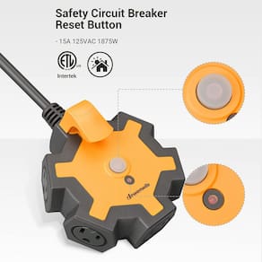 Este cabo de extensão tem 5 tomadas CA que satisfazem suas necessidades de carregamento multipotência. A potência nominal é 15A/120V/1800W. - ?Design de integração? Combine o cabo de extensão com um hub de energia de 5 tomadas, não há necessidade de conectar outro cabo de extensão, mais seguro de usar. 5 tomadas (125V/15A/1875W) dispostas em círculo com amplo espaço, permite que você use plugues adaptadores volumosos na oficina - Disjuntor de 15 A; o disjuntor integrado de 15 A protege os dispositivos contra sobrecarga e curto-circuito, desliga automaticamente a fonte de alimentação quando a corrente total dos dispositivos conectados exceder 15 A; pressione o botão depois que o filtro de energia desligar. O indicador de energia vermelho permitirá que você saiba que o filtro de linha funciona corretamente - ?Cabo de 7,5 m de comprimento?O cabo de alimentação durável SJTW calibre 14/3C é durável e resistente ao desgaste, antienvelhecimento e luz solar, adequado para uso interno/externo, mas não use em condições úmidas; régua de alimentação extra longa de 7,6 m, dá a você flexibilidade para alcançar tomadas distantes e lugares difíceis de alcançar - ?Capa de segurança giratória?As capas de segurança torcer para fechar são muito fáceis de usar, deslize para fechá-las quando não estiver em uso para evitar efetivamente poeira e objetos estranhos; elimine potenciais riscos elétricos para você e sua família - ?Durável e leve?Feito de material de policarbonato emborrachado resistente, resistente para ambientes rígidos como oficina ou garagem; devido ao seu design compacto e leve, muito fácil de levar para um local de trabalho ou manter à mão na garagem