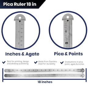 - Régua multiuso de 45 cm – Esta régua pica combina quatro ferramentas de desenho em uma com medidas de pica, pontos, ágata e polegadas. Deve ter uma pequena régua de metal para impressoras medirem o tipo e os desenhos.