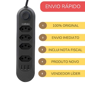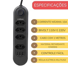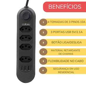 Características: * 4 tomadas de 3 pinos com 10A cada * 3 portas USB 5V/2.1A para carregamento de dispositivos móveis * Botão liga/desliga para controle fácil e seguro * Material retardante de chamas para maior segurança