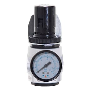 Regulador de pressão 1/4" com manômetro, projetado para controlar e monitorar a pressão com precisão. Possui entrada horizontal de 1/8", ideal para diversas aplicações em sistemas pneumáticos.