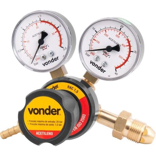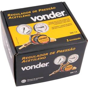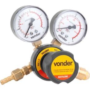 Regulador De Pressão Acetileno Rac1,5 - Vonder Conteúdo da embalagem 1 Regulador de pressão. Acompanha: 1 conjunto de porca e niple para conexão em mangueiras. Aplicações e dicas de uso Indicado para uso com acetileno em aplicações industriais de solda, corte e aquecimento. Linha média. Destaques e diferenciais Possui corpo em latão forjado e capa em alumínio injetado com pintura epóxi, proporcionando maior resistência. Atende as exigências das normas EN-2503 / ABNT 14250 / ABNT 225-2 e CGA E1-22. DETALHES TÉCNICOS