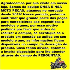 Agradecemos Por Sua Visita Em Nossa Loja. Somos Da Equipe Dnsa E Nsa Moto Peças, Atuamos No Mercado Desde 2014! Nesse Período, Pudemos Confirmar Que Grande Parte Das Peças Para Motocicletas São Específicas A Modelos E Anos, Por Esse Motivo Pedimos Por Favor Que Antes De Realizar A Compra, Se Certifique Se O Produto Em Questão Se Aplica Em Seu Modelo E Ano, As Informações Ficam Disponíveis No Campo Da Descrição Do Produto. Caso Tenha Dúvida, Estamos A Inteira Disposição Para Lhe Atender Através Do Campo De Perguntas.