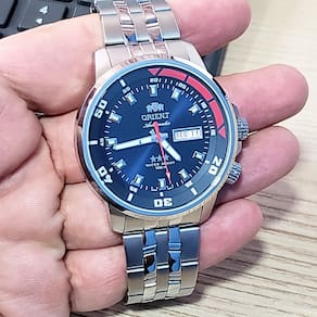 Marca: Orient Modelo: 469SS058F D1SX Tipo de relógio: Analógico Gênero: Masculino Cor da caixa: Prateado Cor da pulseira: Prateado Estilo: Casual Alarme: Não Cronômetro: Não Calendário: Sim - Português e Inglês Luz: Não – ponteiros e marcadores fluorescentes Resistência à água: Sim – 10 ATM = 100 metros Tipo de fecho: Dobrável, com trava de segurança Material da caixa: Aço Inoxidável Material da pulseira: Aço Inoxidável Características do vidro: Vidro mineral Tamanho da caixa (A x L): 52,3 × 49 mm Espessura da caixa: 15 mm Comprimento da pulseira: 25 cm Largura da pulseira: 22 mm Tampa do fundo: Rosqueado Peso: 145 Gramas Alimentação: Automático Garantia do Fabricante: 12 meses Fabricante: Orient Relógios da Amazônia LTDA