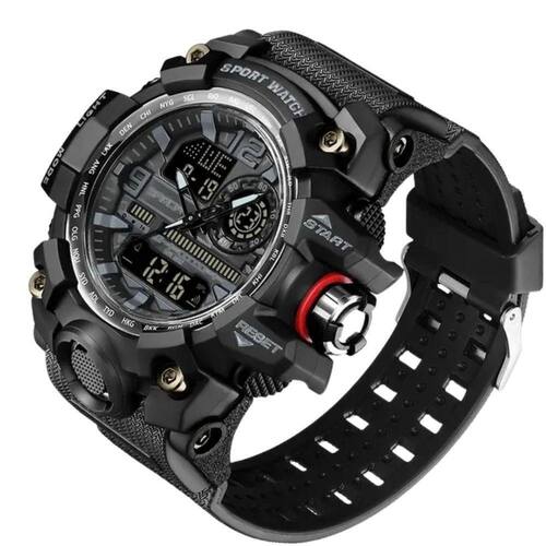Especificações: [Mostrador analógico-digital:] Este relógio oferece tanto a comodidade do mostrador digital quanto o charme do analógico, tudo em um display único. [Design robusto:] Com uma espessura de 15mm e uma largura de banda de 20 a 24mm, feito em resina de alta qualidade, este relógio foi projetado para aqueles que exigem durabilidade. [Funcionalidades inteligentes:] Inclui cronômetro, tela de LED e função de alarme, garantindo que você esteja sempre no controle de seus compromissos e atividades. [Resistência fantástica à água:] Este relógio é adequado para nadar, graças à resistência de até 5bar, o que o torna perfeito para atividades aquáticas. [Estilo esportivo sofisticado:] Com uma fivela prática e um aro em hardlex durável, combinado com o movimento de origem de alta tecnologia, este relógio garante estilo e confiabilidade em um só adornamento.
