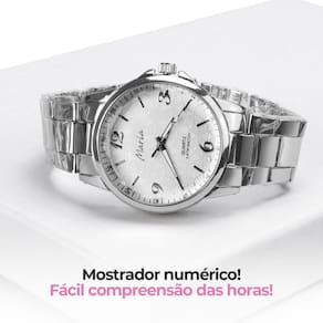 O design refinado do Orizom Maria destaca-se pela harmonia entre o aço prata e o fundo branco, conferindo uma estética clássica e atemporal. A pulseira prata, com fecho dobrável e trava, não apenas proporciona um ajuste seguro e confortável, mas também adiciona um toque de requinte, tornando este relógio a escolha perfeita para diversas ocasiões, desde eventos formais até encontros casuais.