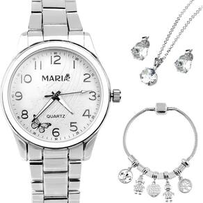 O relógio possui um design moderno e elegante, perfeito para uso diário ou para compor looks sofisticados. Acompanhado por um colar em aço inoxidável prata com um pingente em forma de pedrinha de strass transparente, que adiciona um toque delicado e refinado ao acessório. Os brincos, feitos do mesmo material e design do pingente do colar, complementam o conjunto com harmonia e estilo. Por fim, a pulseira estilo Pandora traz um toque personalizado e moderno ao visual.