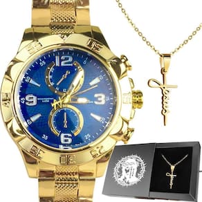Cordão Masculino Dourado com Pingente Cruz Escrita Jesus Relógio Masculino e Caixa Premium Edição Limitada