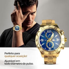 Confeccionado em aço inox de alta qualidade, com acabamento robusto, pesado e design grande. Mostrador azul (podendo ser enviado na cor preta, conforme disponibilidade). Detalhes internos do mostrador, como cronógrafos, designer dos números e aro, podem variar conforme a montagem do relógio no ato da compra. Prova d'água, adequado para uso diário em situações como respingos e chuva leve. Tampa traseira blindada com todos os detalhes de autenticidade.