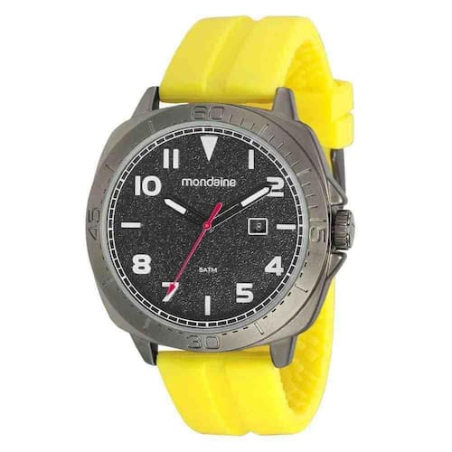 ESPECIFICAÇÕES TÉCNICAS -Marca: Mondaine -Gênero: Masculino -Tipo de mostrador: Analógico -Função: Calendário -Tipo de fecho: Fivela -Cor da caixa: Grafite -Cor do mostrador: Preto -Cor da pulseira: Amarelo -Material da pulseira: Silicone -Largura da caixa: 4,6 cm -Comprimento do relógio: 25 cm -Resistência à água: 5 ATM 50 m -Garantia: 12 meses Ean: 7909669114314