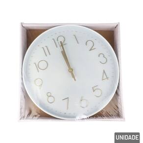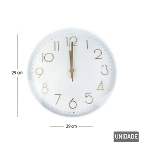 Relógio Analógico de Parede 29cm Redondo Br Decore com pontualidade! O Relógio Analógico de Parede de 29cm Redondo com designs de fundo branco e números grandes em dourado, é a escolha perfeita para quem deseja praticidade em ver a Hora, delicado e cheio de charme. Com estampas exclusivas que remetem a uma bela decoração, este Relógio é ideal para presentear ou decorar.\nSeu formato permite fácil instalação em diversos espaços, como quartos, salas, escritórios, consultórios ou cantinhos especiais do lar. O movimento analógico silencioso garante precisão sem ruídos incômodos, enquanto o visor com números bem definidos facilita a leitura das horas.\nUtiliza: 1x Pilha AA (Não Inclusa). Informação Adicional Marca : TINGS Tipo de material : Componentes Eletrônicos, Plástico Cores ou Estampa : Branco, Dourado Dimensões do Produto : 29 X 29 X 4 CM Dimensões da Embalagem : 31 X 31 X 4,5 CM Peso Bruto (Gramas) : 0.566 Marca: Não Informado