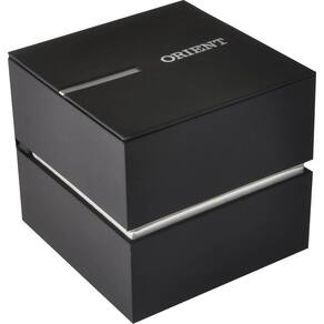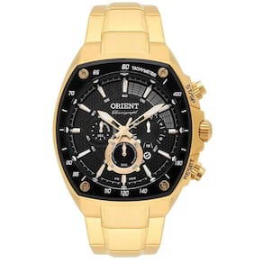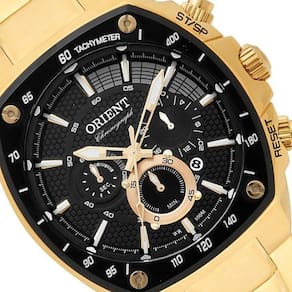Cor do mostrador: Preto com detalhes, marcadores brancos com contorno dourados, ponteiros de horas e minutos dourados com branco na ponta, ponteiro de segundo inteiro dourado